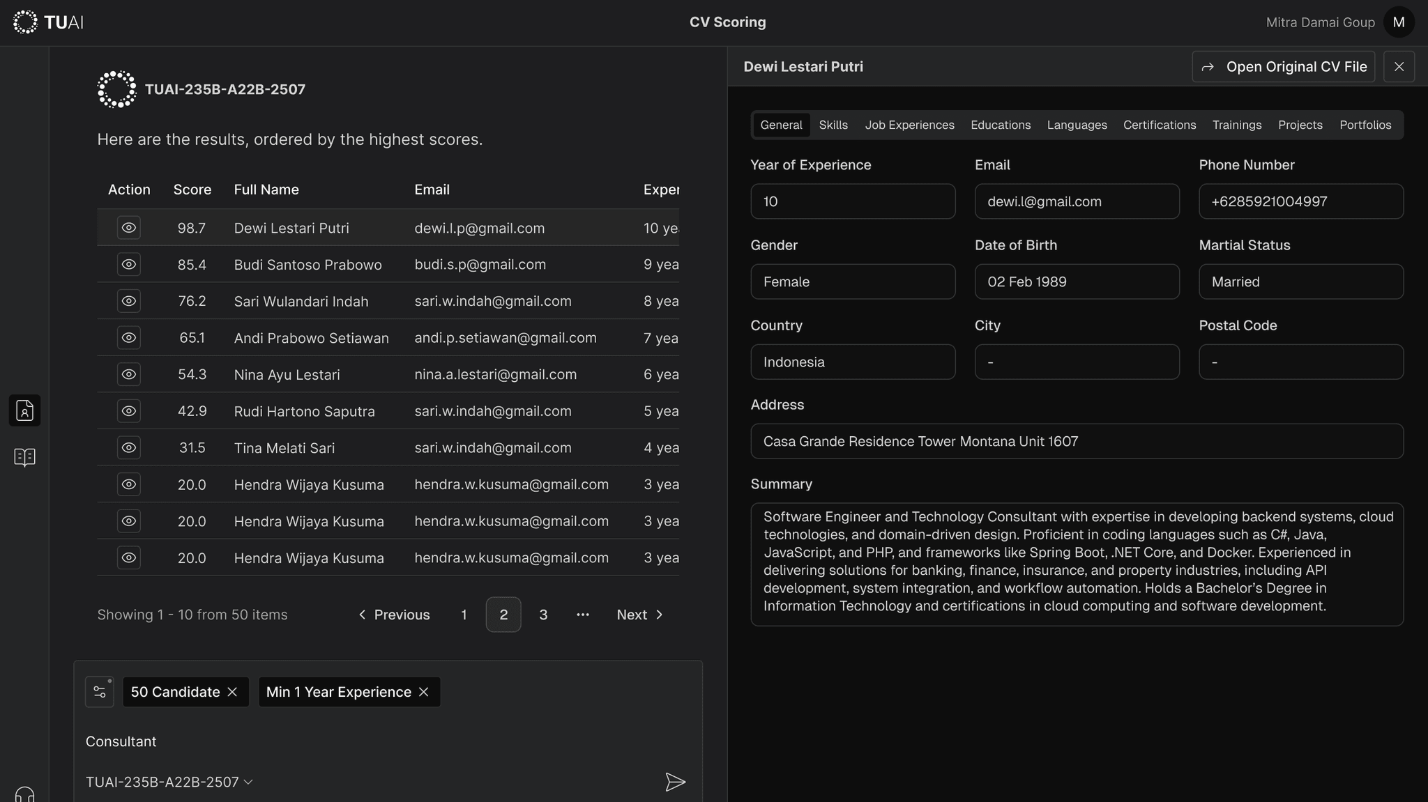 Pengguna cukup mengunggah CV ke TUAI, lalu teknologi AI akan memindai setiap detail mulai dari pengalaman kerja, keterampilan, hingga format penulisan. Hasil analisis ditampilkan secara ringkas dalam bentuk skor dan insight, sehingga memudahkan perusahaan menilai kelayakan kandidat dengan cepat dan objektif.